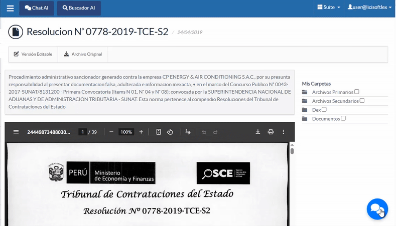 Preguntale a la IA todo lo relacionado a los documentos de tu interes, chatea con Jurisprudencias, Casaciones y la Ley de Contrataciones.